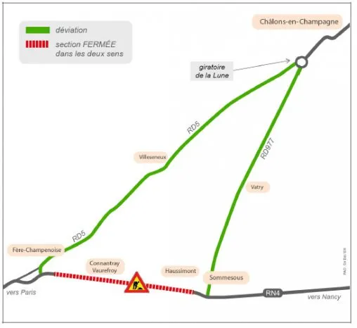 Les usagers en provenance de Paris souhaitant se diriger vers Nancy seront invités à emprunter la RD5 en direction de Châlons-en-Champagne jusqu’au giratoire D5/D977/Bvph dit « giratoire de la Lune » puis la RD977 jusqu’à l’intersection N4/D977 à Sommesous où ils retrouveront la direction Nancy.