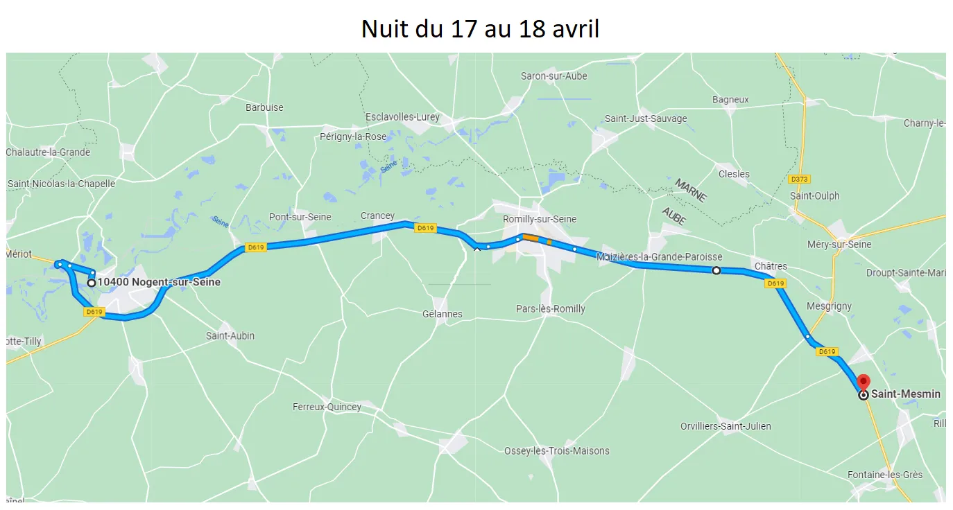 Départ du Port de l’Aube à Nogent-sur-Seine, la RD 919 et la RD 619 via la traversée de Romilly-sur-Seine et stationnement sur l’aire d’arrêt dit du « Pilori » entre Le Petit-St-Georges et Fontaine-les-Grés.
