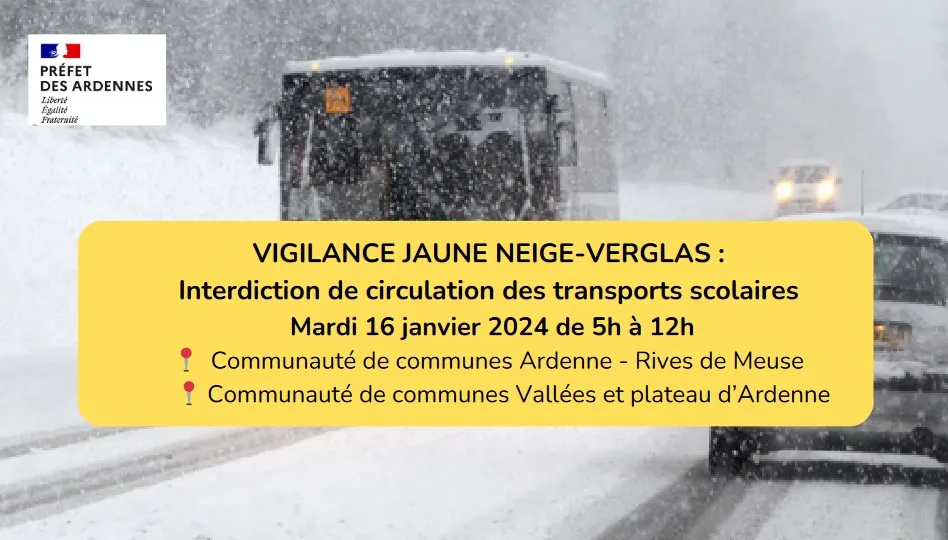En raison des conditions climatiques, la Préfecture des Ardennes a déposé un arrêté préfectoral interdisant la circulation des transports scolaires ce mardi 16 janvier 2024 de 5h à 12h, sur les communautés de communes "Ardennes rives de Meuse" et "Vallées et plateau d'Ardennes".