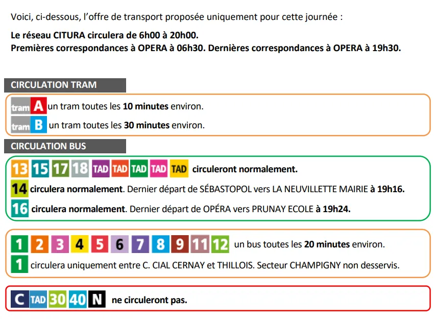 A Reims, Citura annonce qu'un préavis de grève a été déposé pour cette journée mais le trafic devrait être légèrement moins perturbé.