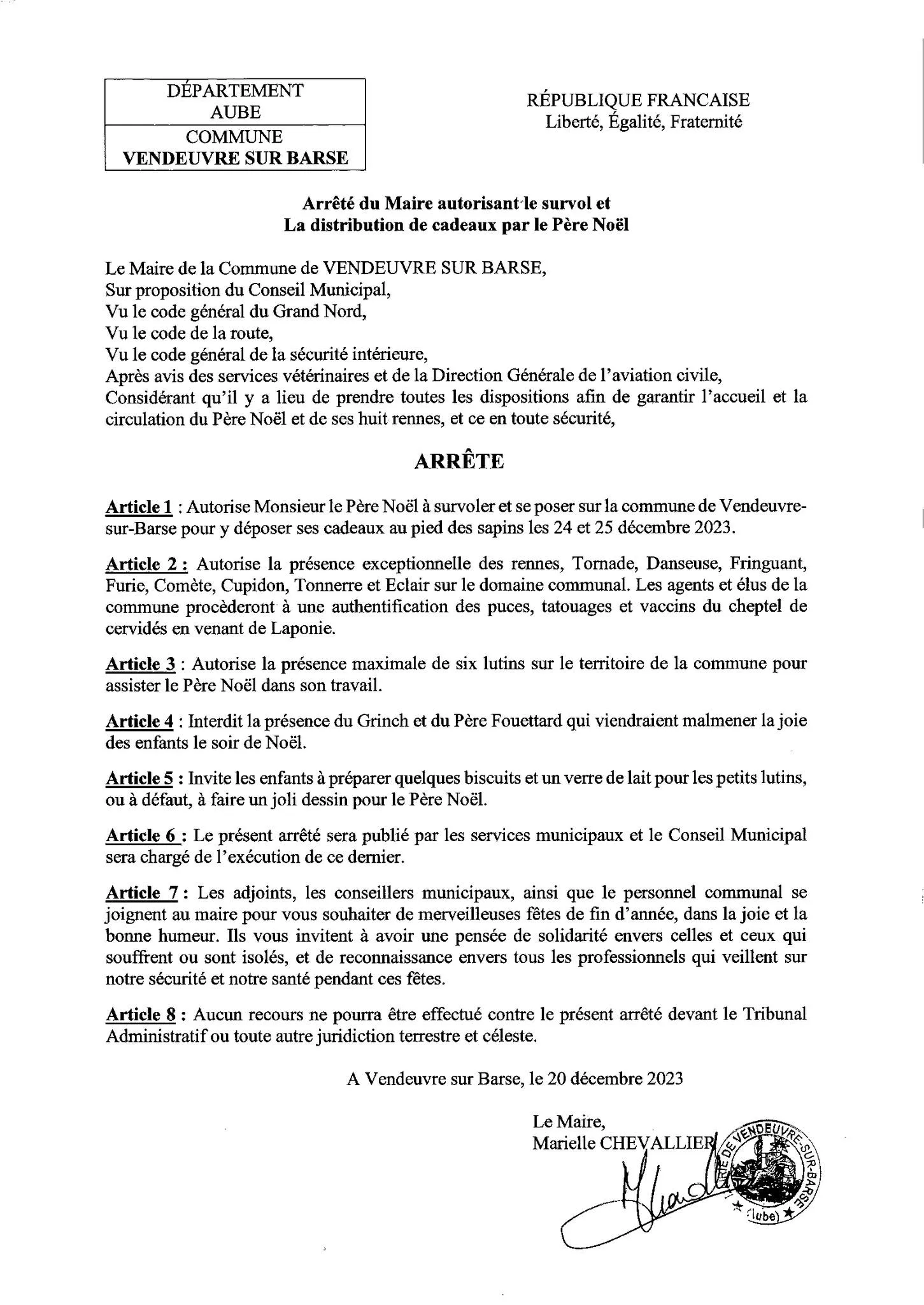 La maire de la commune, Marielle Chevallier, a pris un arrêté pour "l’autoriser à survoler et se poser sur la commune afin d’y déposer ses cadeaux au pied des sapins les 24 et 25 décembre".